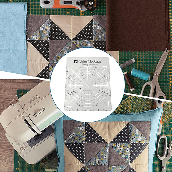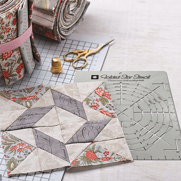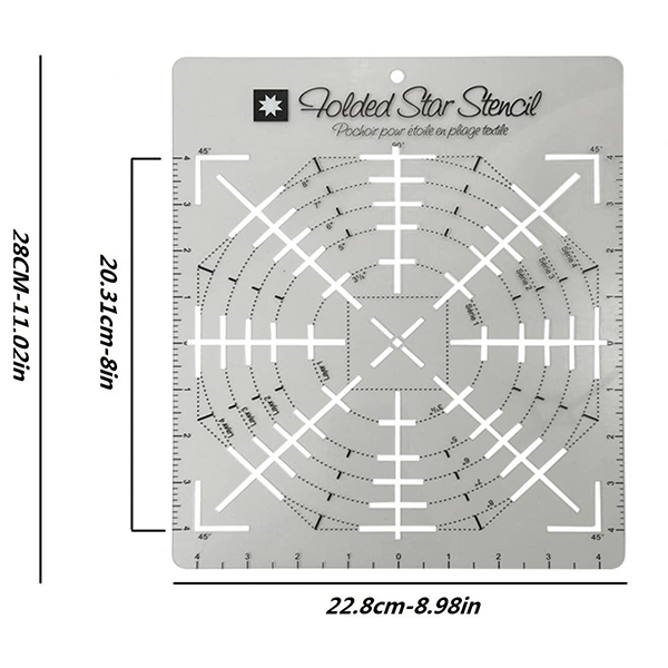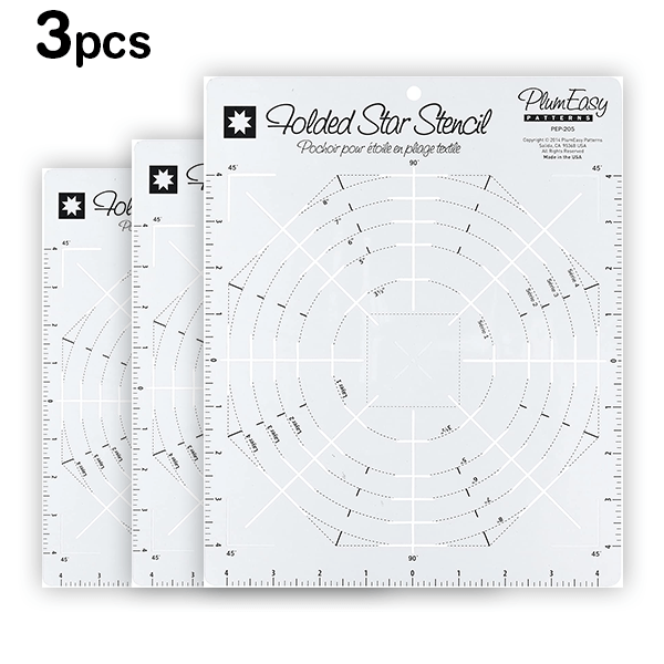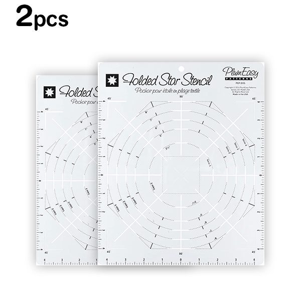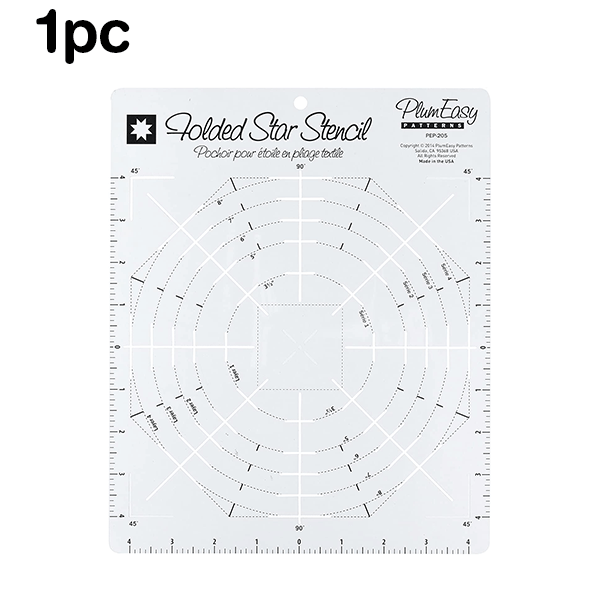 The first of its kind, the Folded Star Stencil tool creates a measurement method to place fabric in equal distances from each other and from the center of the star.